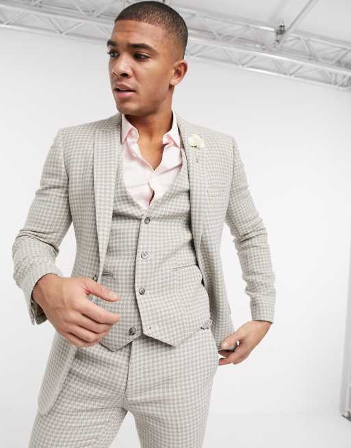 Asos Design Wedding Super Skinny Suit Jacket In Neutral Wool Blend Houndstooth Asos